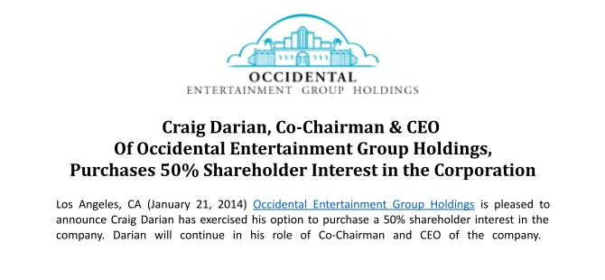January 21, 2014News & Press ReleasesBy adminMarch 17, 2014Craig Darian purchases 50% Shareholder Interest in Occidental Entertainment Group Holdings.